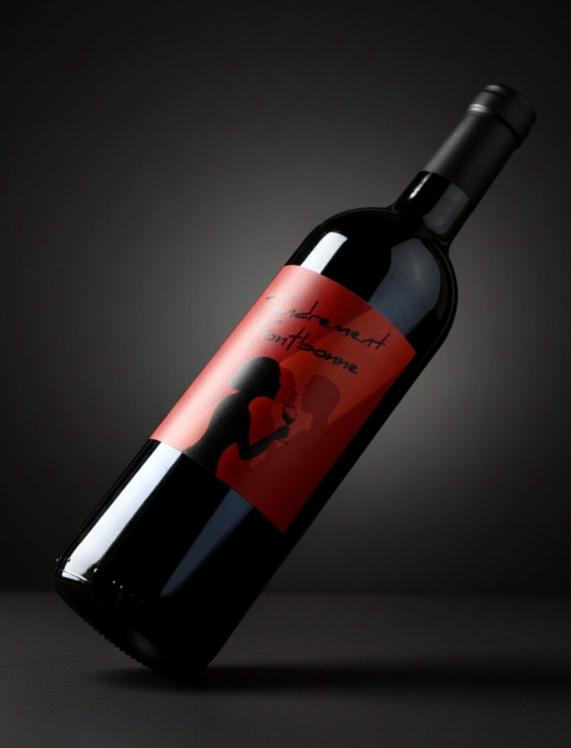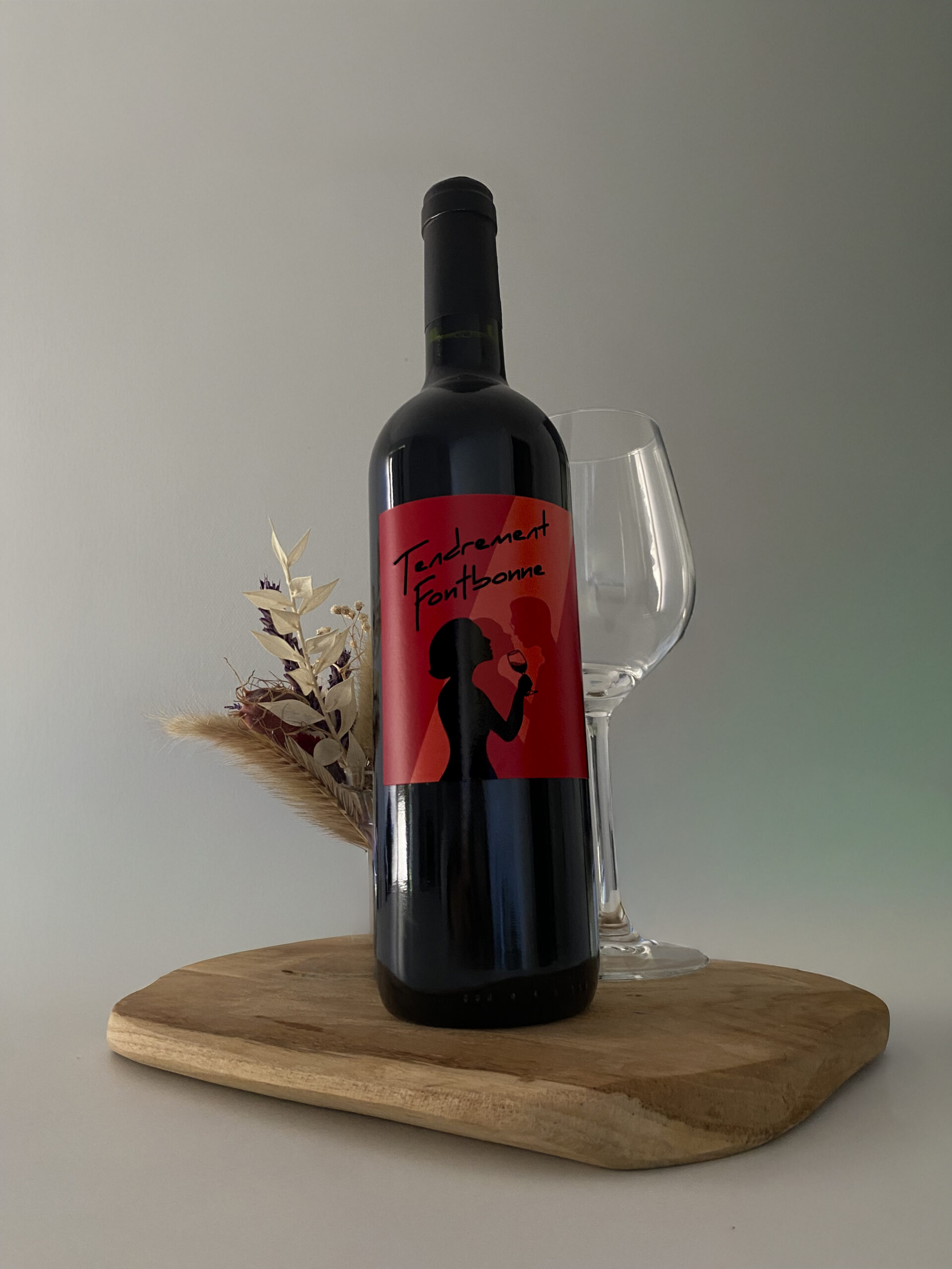 Illustration pour l’étiquette d’une bouteille de vin du Château Fontbonne. La cuvée Tendrement Fontbonne évoque à la fois la passion et la tendresse, des émotions qui ont inspiré la création de cette illustration. À travers un verre de ce vin, on perçoit la douceur et la complicité d’un moment partagé.